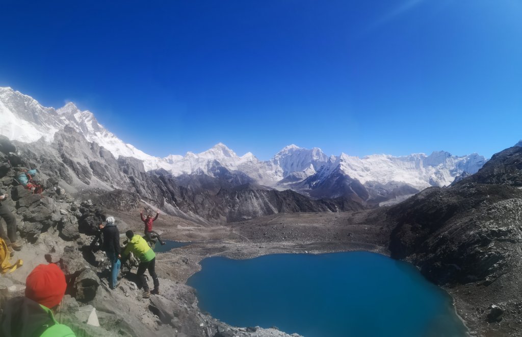 Offizieller Teil: Auch für die dritte und letzte Passüberschreitung heißt es noch einmal zeitig aufstehen, denn die Überquerung des 5535 m hohen Kongma La ist erneut eine lange und anstrengende Trekkingetappe. Zuerst überquert man in leichtem Auf und Ab den schuttbedeckten Khumbu-Gletscher mit tollen Gletscherseen, die zahlreiche gute Fotomotive bieten. Jenseits des Gletschers führt ein schmaler, im oberen Teil steiniger Pfad stetig aufwärts zum Pass. Von der Passhöhe aus genießen Sie einen großartigen Fernblick über den türkisfarbenen See unterhalb des Pokalde zum kühnen Zahn der Ama Dablam (6812 m), auf Baruntse (7129 m) und Makalu (8485 m). Besonders beeindruckend ist auch die Nähe zur gigantischen Lhotse-Nuptse-Flanke, die direkt über dem Pass aufragt.